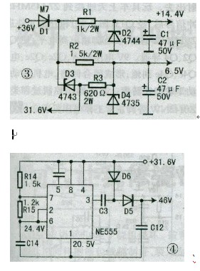 1.穩(wěn)壓電路 :該控制器的穩(wěn)壓電路如圖3所示(圖中 元件位號(hào)為自編號(hào))。其電路較簡(jiǎn)單,采用電 阻降壓、穩(wěn)壓二極管穩(wěn)壓,此方式已被越來(lái) 越多的無(wú)刷控制器所采用。 由于該控制器采用了無(wú)刷電機(jī)專用控 制芯片MC33035,加之驅(qū)動(dòng)電路供電由 NE555升壓后供給,所以對(duì)穩(wěn)壓電源的輸出 功率要求較低,采用穩(wěn)壓二極管穩(wěn)壓即能滿 足需求。 電池電壓+36V一路經(jīng)R1降壓‘、.c1濾 波后得到約+14.4V電壓,為MC33035DW 及過(guò)流、欠壓檢測(cè)IC(LM358)供電;另一路 經(jīng)R.2、I)4、C2穩(wěn)壓至6.5V,為轉(zhuǎn)把及霍爾 供電(此電壓在控制器所附的接線說(shuō)明圖中 標(biāo)注為5V,但實(shí)測(cè)為6.5V)。另外,此電源中 31.6V的取法較特殊,利用穩(wěn)壓二極管D3 的穩(wěn)壓特性,將R3和D4上的電壓穩(wěn)壓 為+31.6V,作為NE555的供電電源。圖中 D1為防反接二極管,防止因電池正負(fù)極連 接錯(cuò)誤損壞電路。 值得一提的是,該電路中的穩(wěn)壓二極管 的型號(hào)標(biāo)注分別為4744.、4743、4735,其實(shí)測(cè) 穩(wěn)壓值分別為14.4V、12.2V、6.5V。此類穩(wěn)壓 二極管標(biāo)注不同于常規(guī)標(biāo)法,難以通過(guò)型號(hào) 得知其穩(wěn)壓值。實(shí)修中,可換用相同或相近 穩(wěn)壓值的穩(wěn)壓二極管,但功率應(yīng)不小于1W。