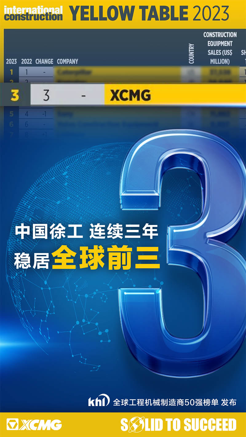 6月1日,由全球工程機械行業(yè)知名資訊集團KHL旗下《International Construction》雜志權(quán)威發(fā)布的Yellow Table榜單顯示,中國制造商徐工XCMG蟬聯(lián)第三位。徐工也成為唯一連續(xù)三年躋身全球前三甲的中國工程機械制造商!