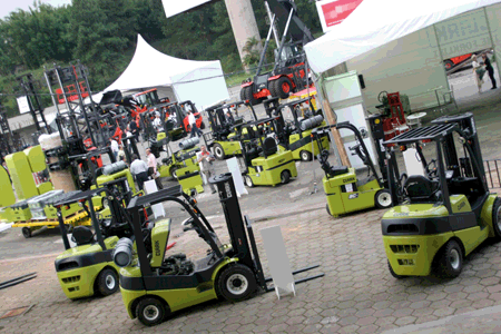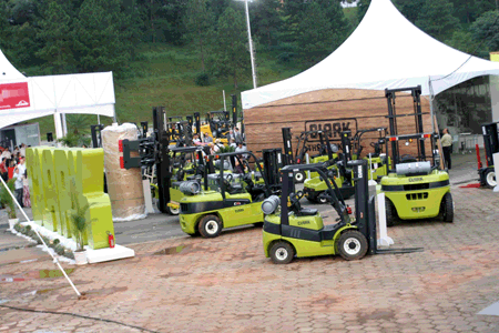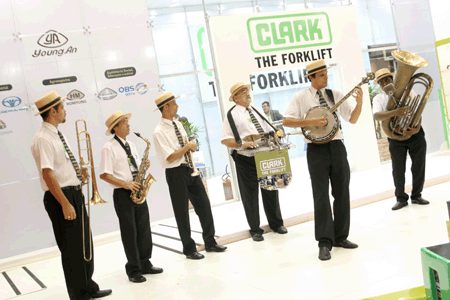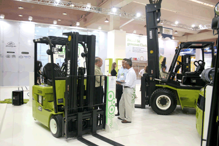 CLARK,身著傳統(tǒng)環(huán)保CLARK綠色元素的標準圖案閃亮登場,12臺品字排開,氣勢奪人,另有配件展示在集裝箱區(qū)域內(nèi)做演示,展示強大售后服務力量,這是其品牌目前所不能披靡的。CLARK的亮點吸引了眾多的客戶和同行前來參觀。由于參展產(chǎn)品的創(chuàng)新性及強烈的美國優(yōu)良品質(zhì)特性,吸引了眾多感興趣的客戶簽約及洽談后期合作。